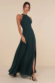 Dark Green Chiffon Halter Neck Prom Dress with High Side Slit Floor Length Elegance for Glamorous Ball Occasions