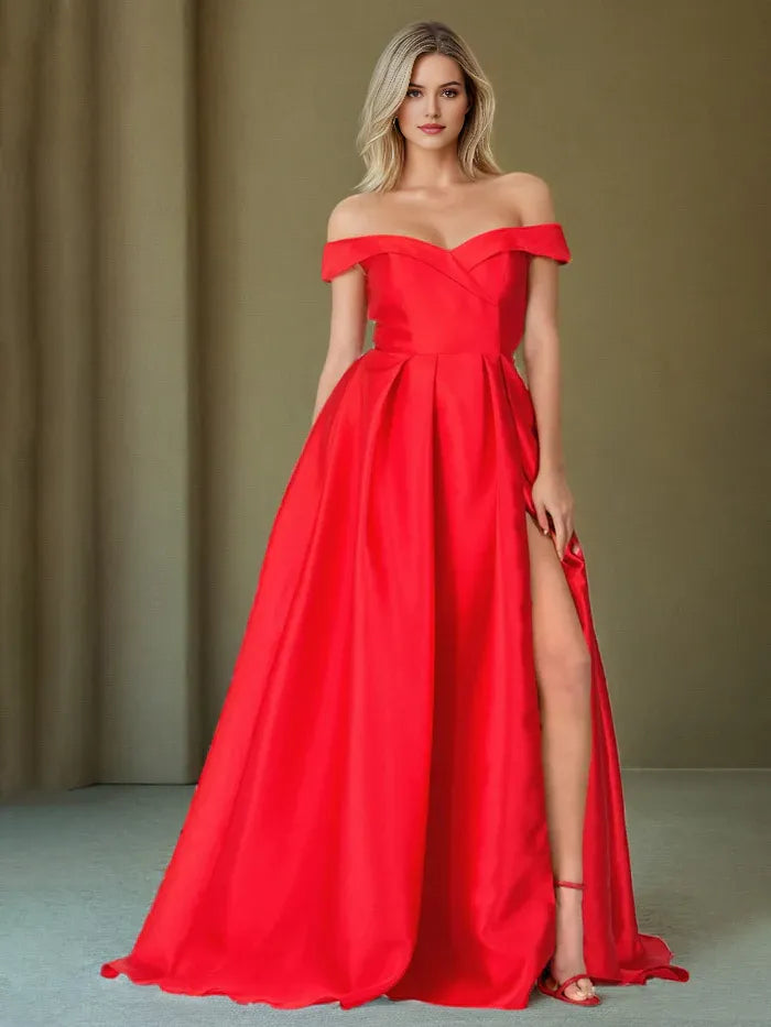 Elegant A Line Off The Shoulder Long Satin Prom Dress With Slit - Red / US 2 / UK 8 / EU 32
