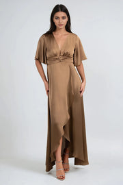 Romantic Mocha A-Line Plunging V-Neck Flutter Sleeve Knot-Waist Satin Back Zip High-Low Prom Dresses Hot Sale