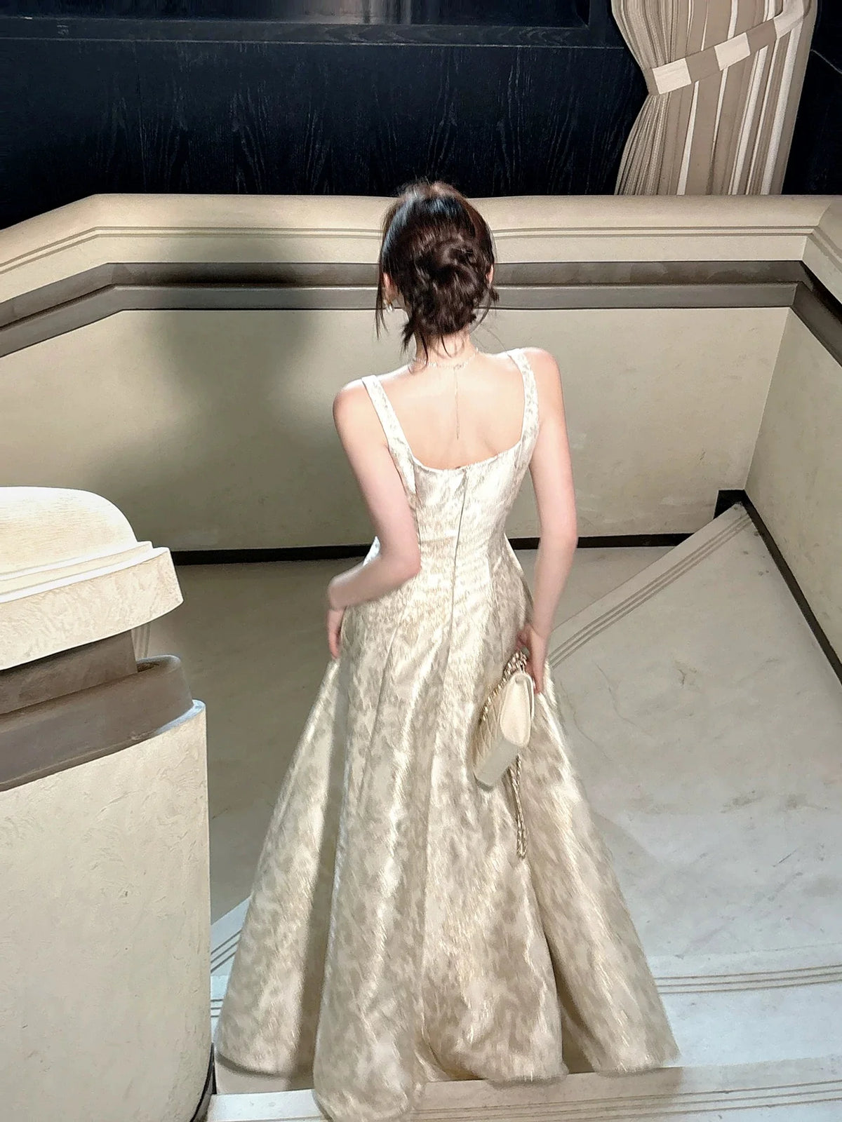 Luodilan's elegant ivory maxi prom dress features a classic square neckline with wide shoulder straps, paired with a flowing A-line silhouette that flatters all body types. The entire dress is crafted from luxurious jacquard fabric with delicate gold floral patterns, creating a subtle shimmer and vintage-inspired texture that catches the light with every movement. The structured bodice accentuates your waist, while the full skirt cascades to the floor in gentle pleats, forming a dreamy, ethereal silhouette. The back showcases a low square cut and a zipper closure, ensuring a secure, tailored fit while highlighting your shoulders and back.