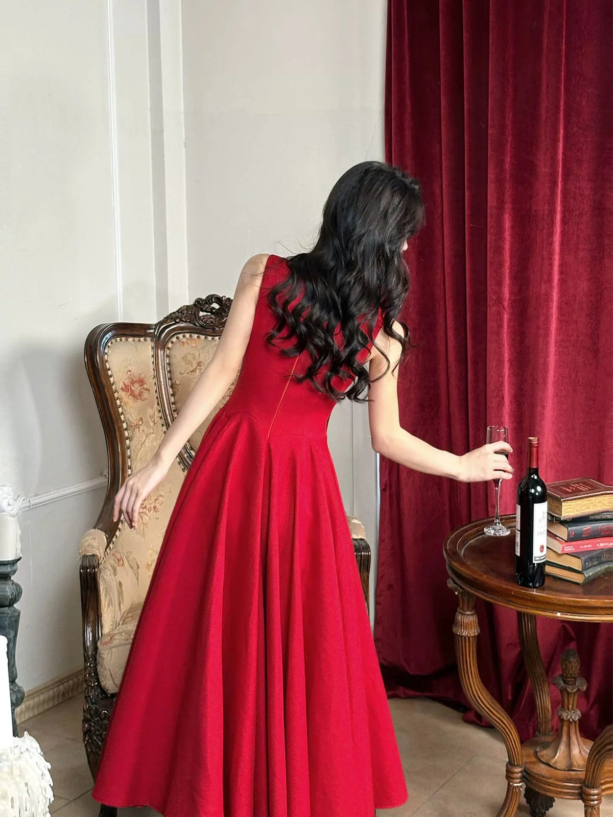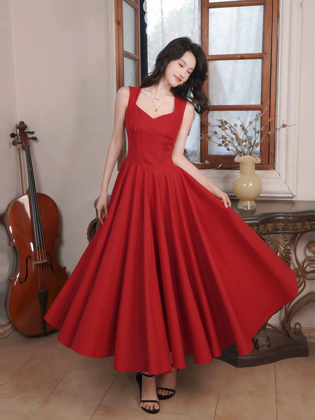 Luodilan's elegant red midi prom dress features a romantic sweetheart neckline with wide sleeveless straps, paired with a voluminous A-line silhouette that flatters all body types. The structured bodice includes vertical boning details to accentuate your waist, while the full skirt flares into a dramatic circle shape that flows gracefully with every step. Crafted from smooth, structured fabric, the dress has a polished, timeless finish, with a clean back design featuring a zipper closure for a secure, tailored fit.