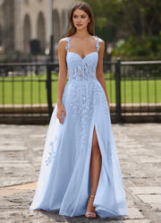 Elegant Black A-Line Sweetheart Neck Sleeveless Floral Lace Tulle Sweep Train Prom Dress with Appliqued Beading - Sky Blue / US 2 / UK 8 / EU 32