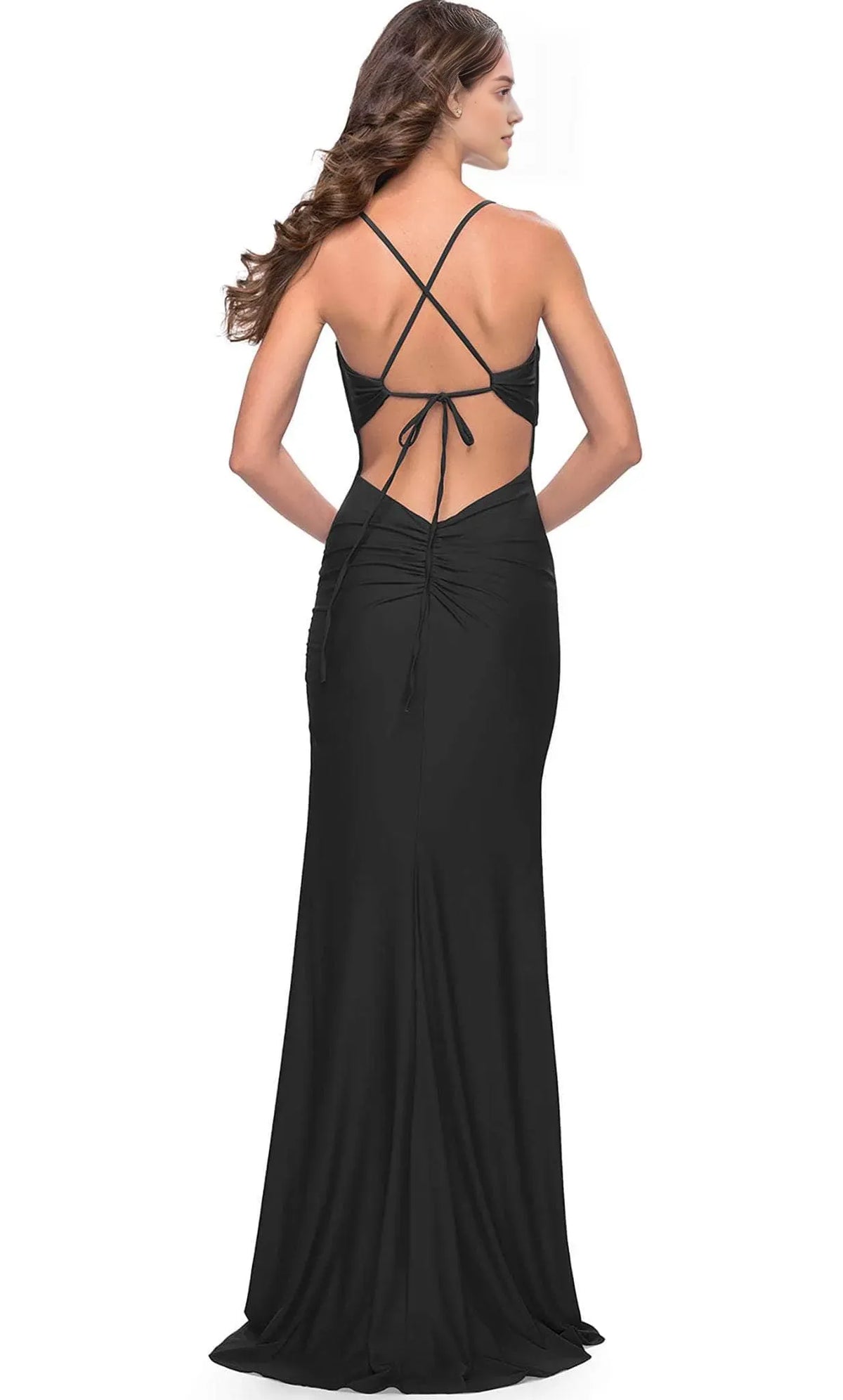 Elegant Black Jersey Knit Prom Gown with Ruched Detailing and High Slit for Formal Occasions  - Black / US 2 / UK 8 / EU 32
