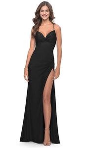 This sophisticated prom dress is expertly crafted from premium black jersey knit fabric, celebrated for its soft, stretchy texture that hugs the body in a flattering, comfortable fit. The ruched detailing on the bodice and side adds a touch of dimension and elegance, while the daring high slit allows for graceful movement as you dance the night away. The delicate spaghetti straps and sweetheart neckline create a classic, feminine silhouette, perfect for making a memorable entrance at formal dances, galas, and special events. Whether you’re twirling under the lights or mingling with guests, the jersey knit material ensures you’ll radiate confidence, charm, and an air of refined sophistication, making every moment of your prom night truly unforgettable.