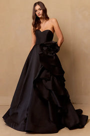 Elegant Black Satin Ball Gown Prom Dress with Strapless Sweetheart Neckline and Dramatic Ruffled Side Detail for Formal Galas - US 2 / UK 8 / EU 32