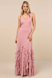 This exquisite prom dress in a soft blush pink hue is crafted from a stretchy jersey fabric that hugs the body to create a flattering, figure - hugging silhouette. The plunging V - neckline adds a touch of romance and allure, drawing attention to the neckline and bust. A tiered ruffle hem at the bottom of the dress introduces a playful and feminine element, with each ruffle layer flowing gracefully to add movement and texture. The dress’s fitted bodice transitions smoothly into the floor - length, ruffled skirt that sways with every step. Whether you're attending prom, a gala, or another upscale event, this dress combines the comfort of jersey fabric, the charm of a plunging V - neckline, and the unique detail of a tiered ruffle hem to ensure you stand out with elegance and style.