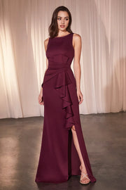 Elegant Burgundy Satin Prom Gown with Asymmetric Ruffles and High Side Slit A Timeless Statement for Formal Affairs
