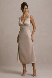 Elegant Champagne - Hued Satin Prom Dresses with Plunging V - Neck Ruched Shoulder Details and Flattering Fit A Timeless Choice for Sophisticated Balls Graceful Galas and Refined Evening Soirées - US 2 / UK 8 / EU 32