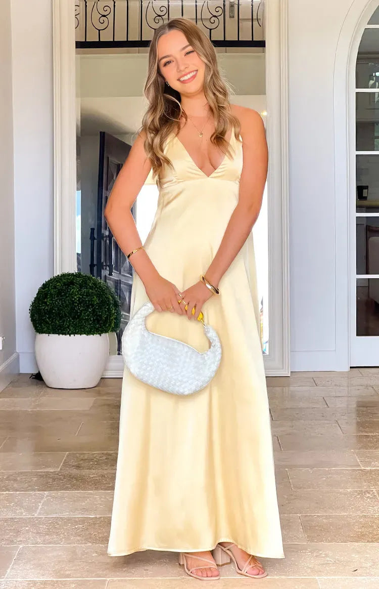 Make a breathtaking entrance in our Yellow Prom Dress a stunning option for prom, a formal, or an elegant wedding guest look. This gown is designed to impress with a deep V-neckline and a dramatic open back, finished with delicate lace-up detailing. Complement this show-stopping piece with simple heels and delicate jewellery to complete your look.