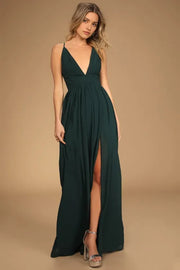 Elegant Dark Green Chiffon Prom Dress with Deep V - Neck Flowy Skirt and High Side Slit for Glamorous Nights