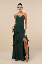 Elegant Dark Green Chiffon Prom Dress with Spaghetti Straps Ruffled Layers Side Slit Perfect for Formal Balls Galas and Special