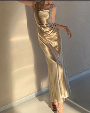 Elegant Gold Satin Backless Mermaid Long Prom Dress Formal Party Dress