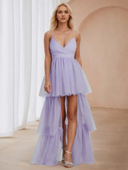 Elegant Lavender Tulle Prom Dresses Spaghetti Straps Tiered High Low Skirt Understated Freshness for Minimalist Events - US 2 / UK 8 / EU 32