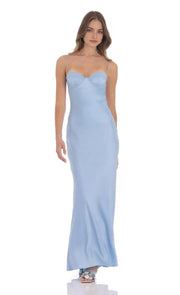 Elegant Light Blue Satin Prom Dress with Spaghetti Straps Bustier Detail Timeless Grace for Formal Galas
