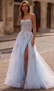Elegant Light Blue Tulle Prom Dresses with Sheer Corset Bodice Intricate Floral Embellishments and High Slit for Formal Occasions