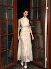 Luodilan's elegant ivory maxi prom dress features a traditional high mandarin collar with a delicate keyhole button detail, paired with a form-fitting mermaid silhouette that hugs your curves perfectly. The sleeveless bodice is crafted from smooth satin fabric, while the skirt is layered with sheer tulle and adorned with intricate white floral embroidery, creating a romantic, vintage-inspired texture that flows gracefully with every movement. The structured waist accentuates your figure, and the mermaid hem flares gently to the floor, adding a touch of drama while maintaining elegance.
