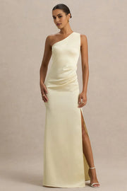 Elegant One - Shoulder Champagne Satin Prom Dress with Side Ruche Detail and High Thigh Slit - US 2 / UK 8 / EU 32