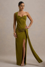 Elegant One - Shoulder Olive Green Prom Dress with Draped Detail Ruched Waist and High Side Slit Perfect for Formal Galas Evening Soirees and Glamorous Occasions - US 2 / UK 8 / EU 32
