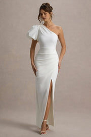 Elegant One - Shoulder Prom Dress with Puff Sleeve Ruched Detailing and High Side Slit Timeless White Formal Gown for Special Evenings - US 2 / UK 8 / EU 32