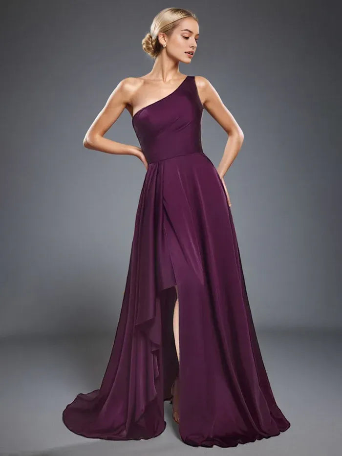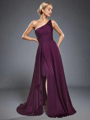 Elegant One Shoulder Sleeveless A Line Ruffles Maxi Prom Dress With Slit - Grape / US 2 / UK 8 / EU 32