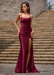 Step into elegance with this column - style prom dress It features delicate square neck , a crisscross - back design, and a high - slit skirt. The floor - length silhouette with rich burgundy satin fabric exudes sophistication, making it perfect for evening events and formal occasions.