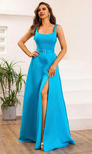 Elegant Satin Square Neck Prom Dress with Belt and Side Slit - Stunning Formal Evening Gown for Special Occasions - US 2 / UK 8 / EU 32