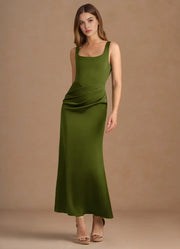 Elegant Square - Necked Olive Green Prom Dress with Ruched Waist Detail and Figure - Hugging Silhouette for Formal Events