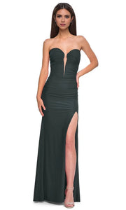 Elegant Strapless Dark Green Prom Dress with Ruched Bodice Plunging Neckline and High Side Slit for Formal Evening Galas