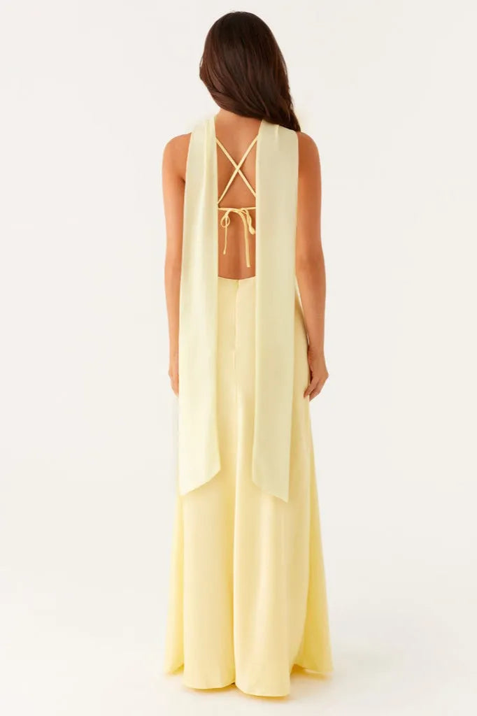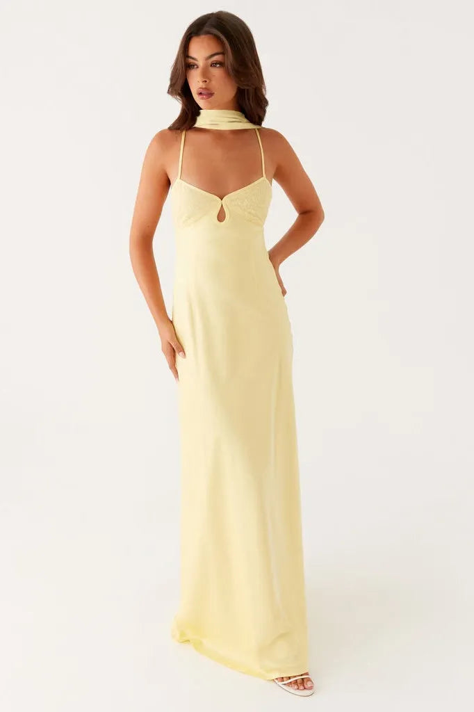 Elegant Yellow Sheath V- Neck Spaghetti Straps Tie Back Scarf Detail Floor-Length Prom Dresses - US 2 / UK 8 / EU 32