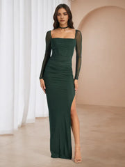 Emerald Green Mesh Sleeve Ruched Prom Dress with Square Neck Side Slit Formal Evening Gown for Dance Events - US 2 / UK 8 / EU 32