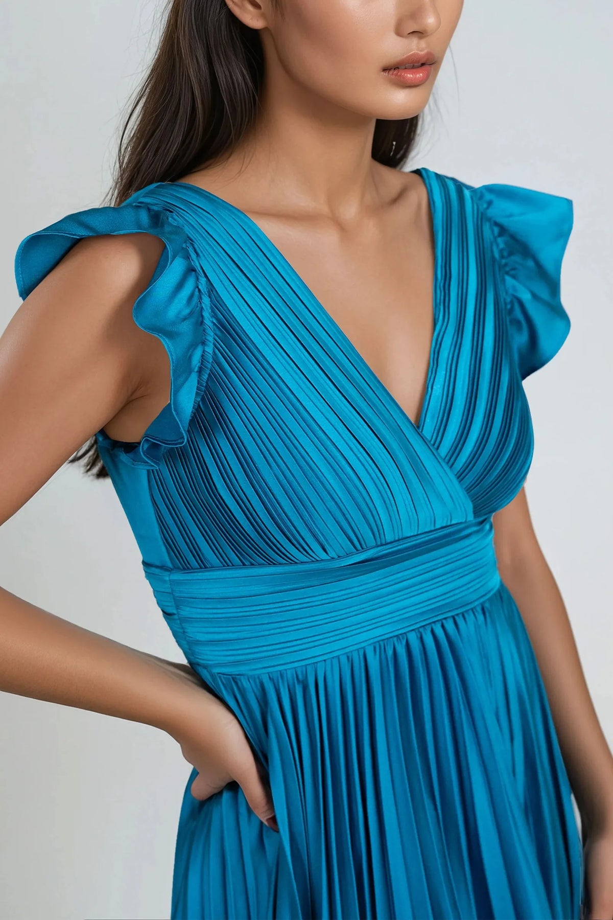 Step into fashionable with LuodiLan's A-line style prom dress. It features a plunging V-neckline, ruffled short sleeves, a pleated bodice and skirt with a waist-defining band, and a high-slit detail. Crafted from shimmering pleated fabric, the gown in vibrant teal exudes modern sophistication and grace, making it perfect for evening events, formal galas, and special occasions.