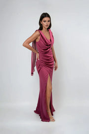 Step into elegance with LuodiLan's mermaid - style prom dress. It features a cowl neck design, draped shoulder details with flowing fabric, and a high - slit skirt. The floor - length silhouette in rich magenta fabric exudes sophistication and allure, making it perfect for evening events and formal occasions.