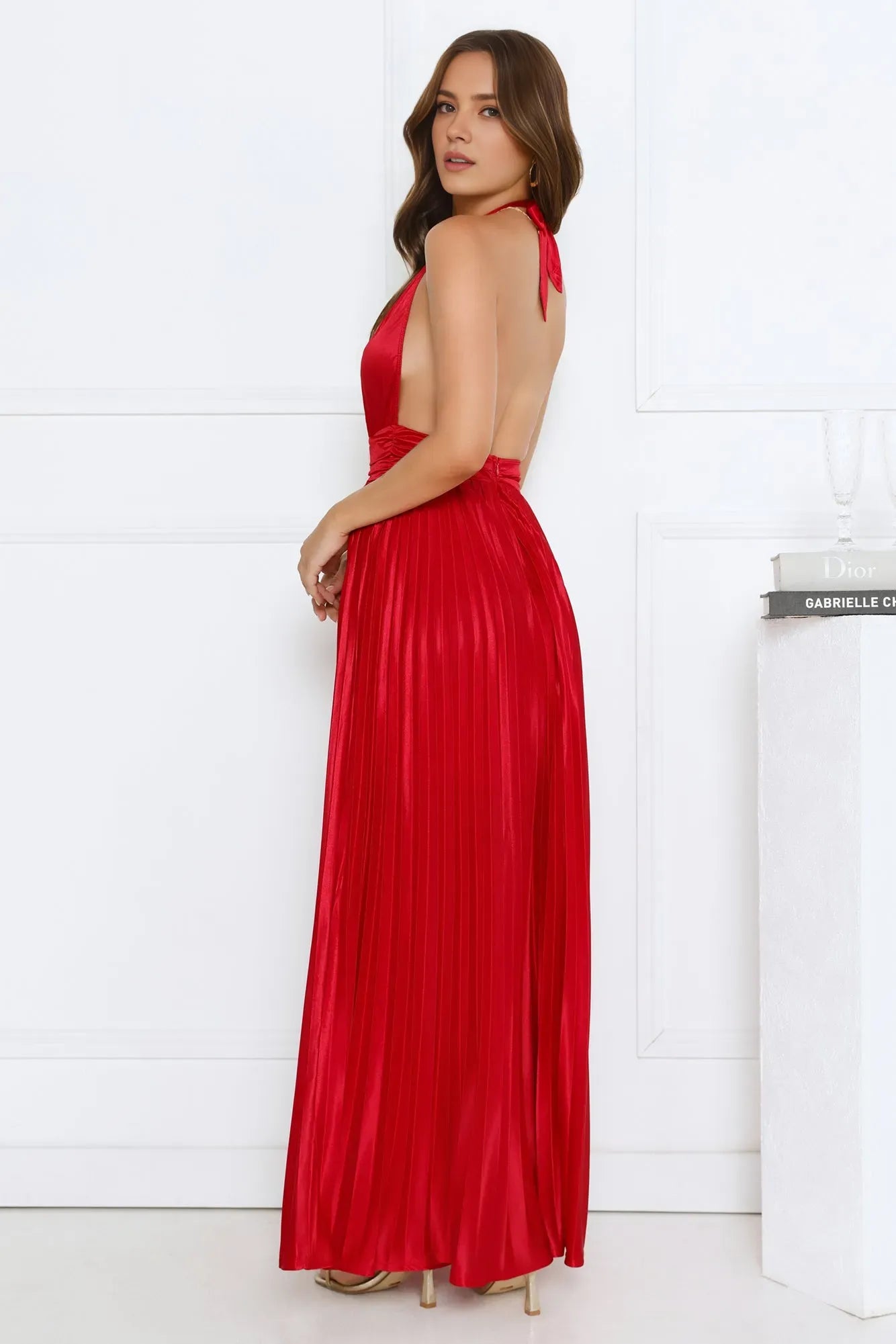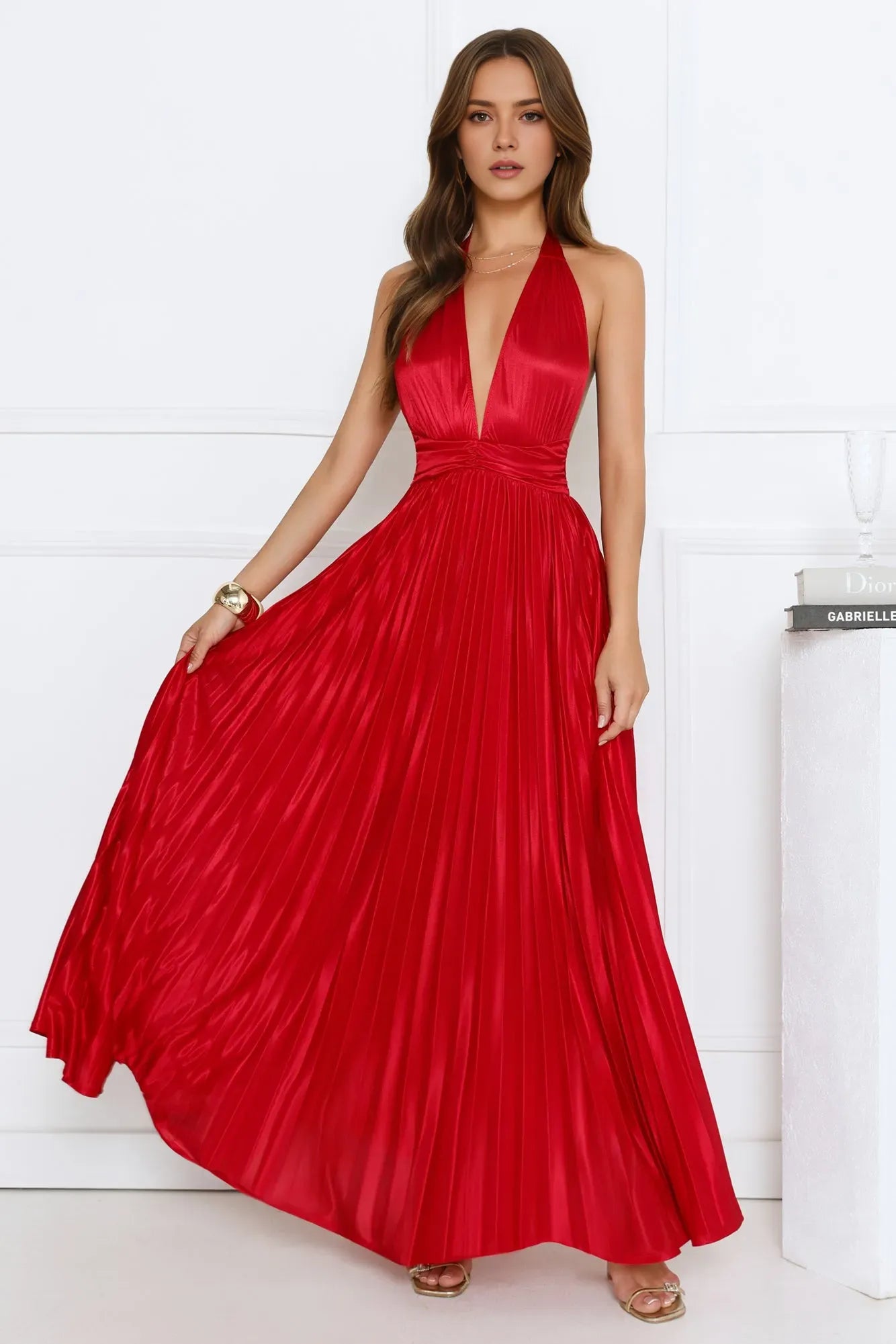 Step into the spotlight with LuodiLan's glamorous prom dress. It features a halter neck and plunging V-neckline that add a touch of allure and sophistication, beautifully showcasing the shoulders .The pleated satin fabric exudes luxury with its smooth, glossy texture and creates elegant movement. The floor-length cut exudes refinement, making it perfect for formal events, galas, or any special occasion where you want to make a stunning entrance.