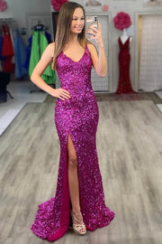 Fuchsia Sequins V Neck Mermaid Long Formal Dress