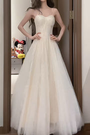 Gentle White Spaghetti Strap A-Line Tulle Sequin Long Prom Dress Simple Birthday Graduation Dress