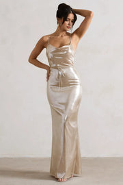 Glamorous Champagne Gold Satin Cowl Neck Prom Dresses with Spaghetti Straps and Waist Tie - US 2 / UK 8 / EU 32