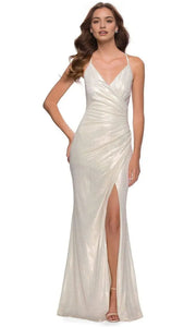 Glamorous Champagne - Gold Shimmering Knit Prom Dress with Halter Neck and High Slit