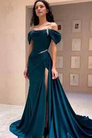High Quality Off The Shoulder Dark Green Satin Prom Dresses Beaded Evening Gown