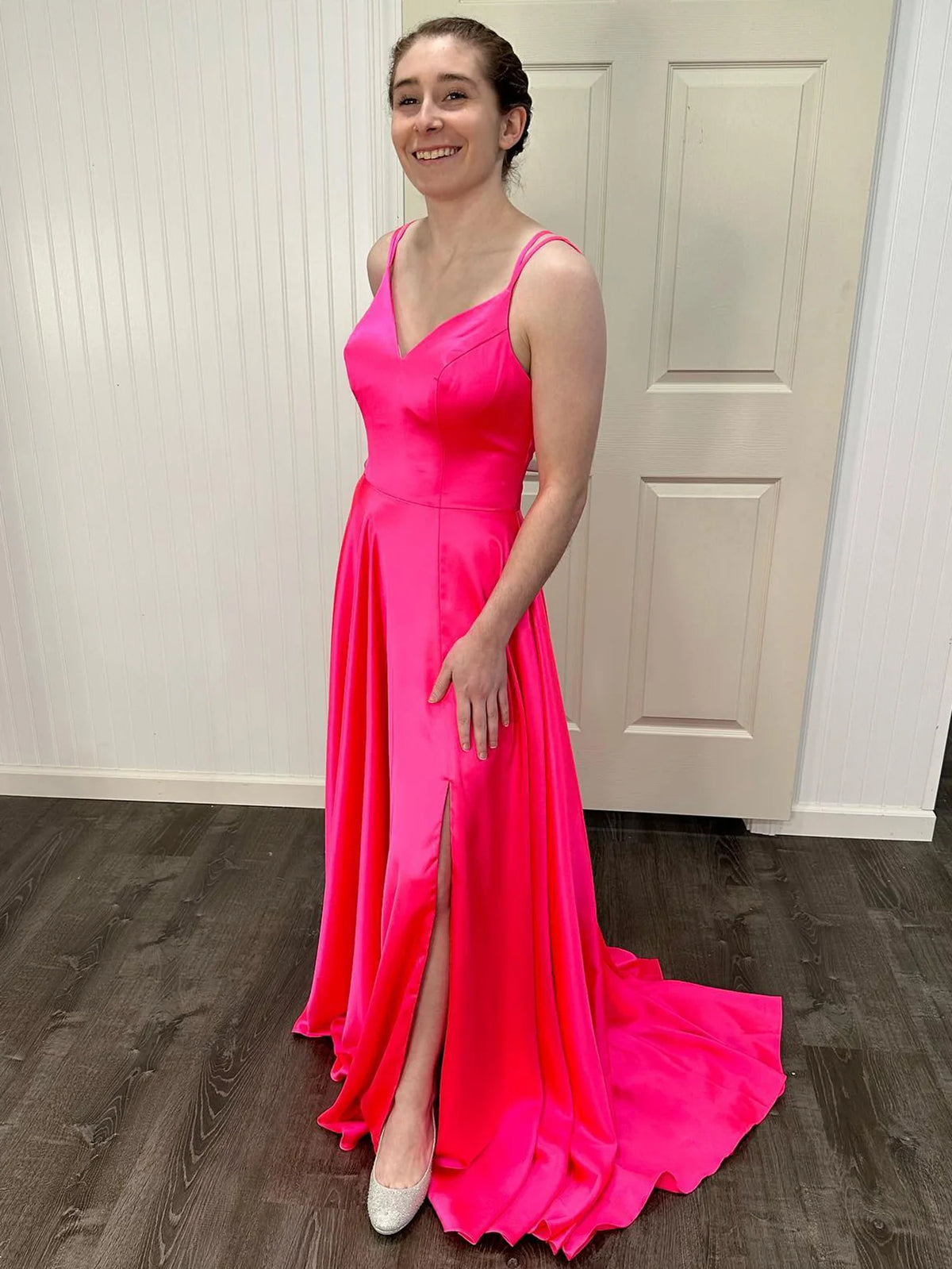 Hot Pink A-line Version V-neck Long Split Ball Dress