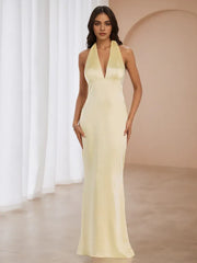 Lemon Satin Halter Prom Dress Plunge V Neck Flowy Silhouette for Dreamy Galas