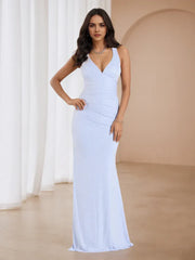 Light Blue Glitter Mermaid Prom Dress with Plunge V Neck Sweet Charm for School Dances