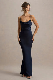 Elegant Navy Satin Prom Dress with Cowl Neckline Spaghetti Straps Bodycon Mermaid Silhouette for Formal Evening Events - US 2 / UK 8 / EU 32