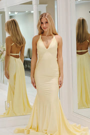 Mermaid Halter Backless Yellow Satin Long Prom Dress