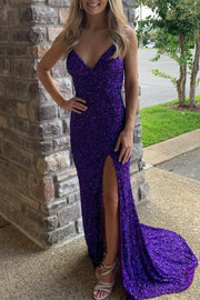 Mermaid Purple Sequins Long Formal Dress with Slit