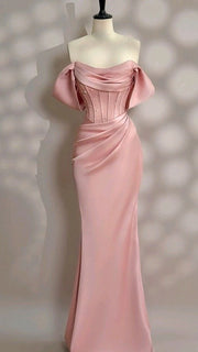 Minimally designed long pink satin off shoulder ball gown and evening gown