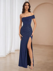 Navy Blue Glitter Prom Dress One - Shoulder Cut Side Slit Accent for Timeless Allure - US 2 / UK 8 / EU 32