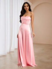 omantic Pink Strapless Prom Gown - Satin Fabric Ruched Top Side Slit
