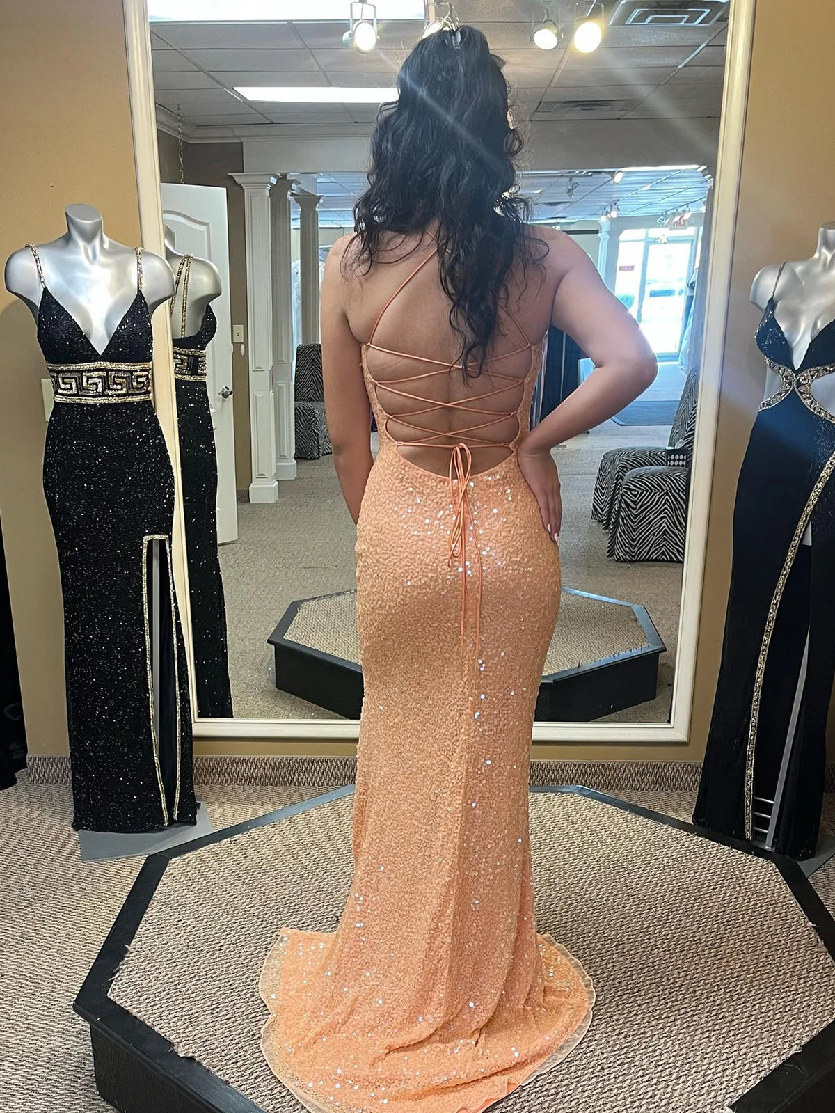 Orange suspender sequin long ball dress with round cross back