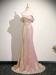 Pink Mermaid Sequins Off the Shoulder Pleats Prom Dress