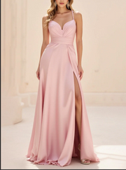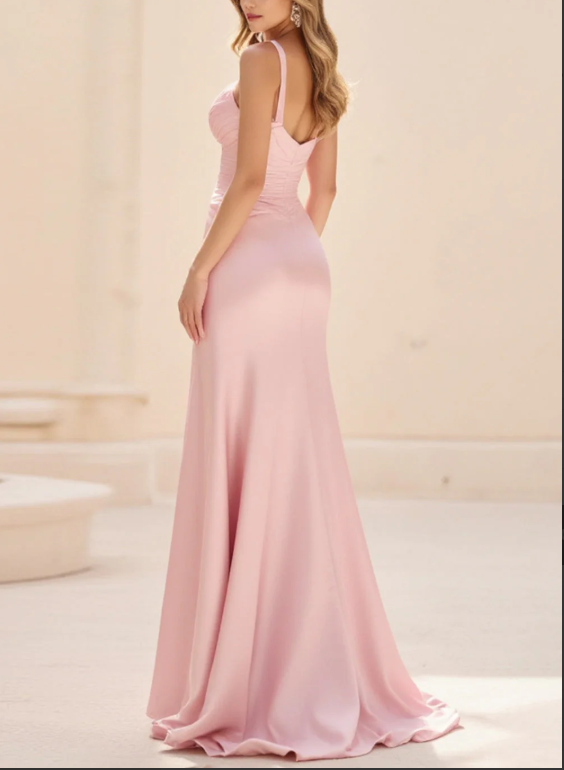 Pink Spaghetti Straps Ruched Long Prom Dress with Slit